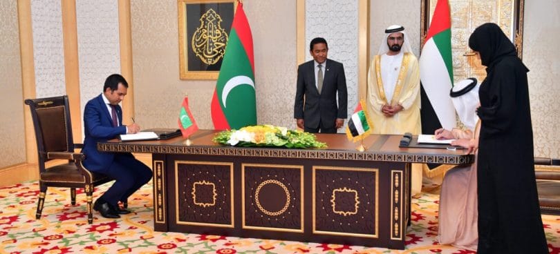 Economic Development Minister Mohamed Saeed signed the agreement on behalf of the Maldives at a ceremony Tuesday at the Ruler’s Court in Dubai.