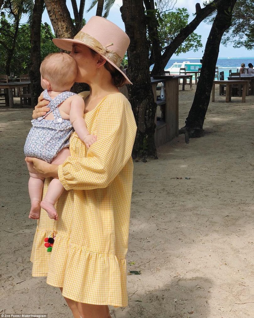 Baby love! Zoe Foster Blake cuddles up to her three-month old daughter Rudy as she continues to enjoy an idyllic $7,000 per-night Maldives work junket with her family