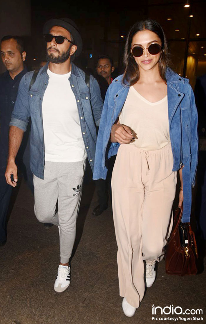 Deepika and Ranveer looked quite cheerful and happy as the two made their way to the car. While Deepika looked super sexy in a pale peach jumpsuit and denim jacket, that was casually laid over her shoulder, Ranveer looked dapper in a casual white tee, grey sweats and a denim jacket.