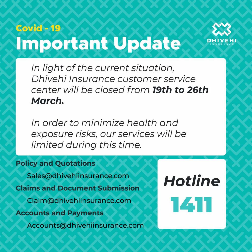 Dhivehi Insurance has announced that they have decided to close its customer service centres from 19th March to 26th March, due to the spread of COVID-19 pandemic in the Maldives.