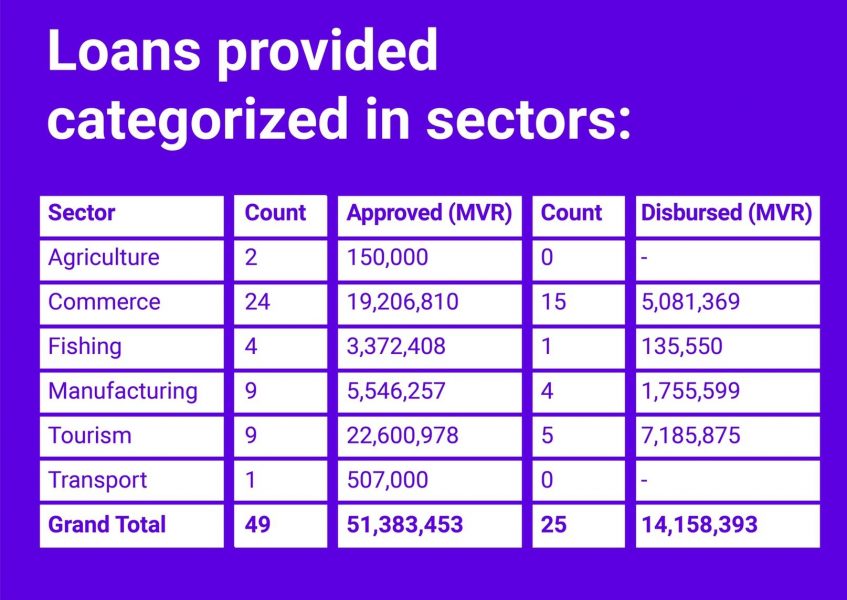 SME loans allocated for women per year takes up 25% of the portfolio. A total of 49 loans have approved, which have a value of MVR 51,383453. From this, the amount disbursed totals to MVR 14,158,393.