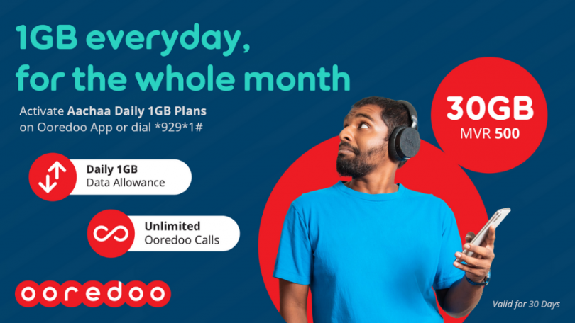 | Aachaa 1GB/Day Monthly Pack | MVR 500 | 30 GB (1GB/ Day) Unlimited Ooredoo Calls | 30 days |