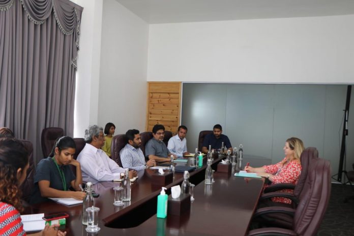 The Minister of Health Abdulla Ameen, State Minister of Foreign Affairs Ahmed Khaleel and officials from the President’s Office and the Ministry of Foreign Affairs met with the United Nations Resident Coordinator, Ms. Catherine Haswell, to discuss how the United Nations system further collaborate and work more closely with the Government during the ongoing emergency health response, to tackle the Covid-19 situation in the country and address the economic impact on the country.