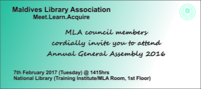 All MLA Members, Non-members, Library Professionals, and interested personnel are invited.  Members will be elected for the vacant posts of MLA council and committees plus activities and tasks accomplished in the year 2016 will be presented.