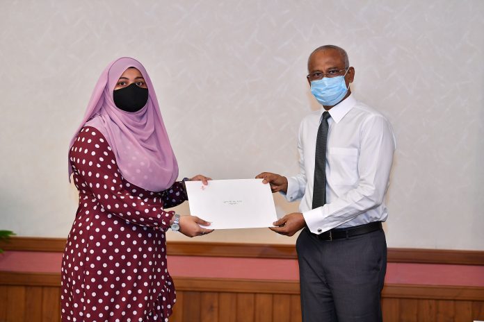 President Solih presented the scholarships to seven students who achieved exceptional results in examinations held in 2019. They included five students from the Centre for Higher Secondary Education (CHSE), who received A+ scores in GCE A levels; and two students from Madhrasathul Arabiyyathul Islamiyya, who received A+ scores in the Shahadha Saanaviyya exams.