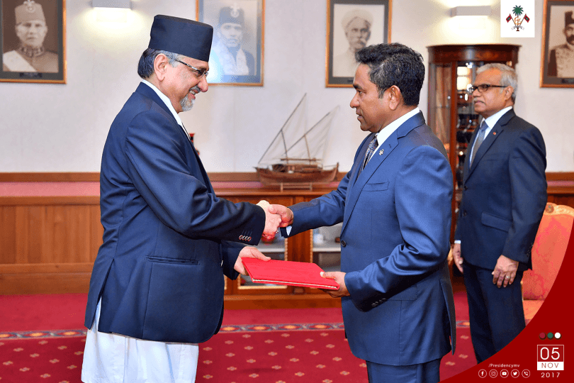 At the ceremony, President Yameen conveyed greetings and good wishes to the President, Her Excellency Bidhya Devi Bhandari and Prime Minister, His Excellency Sher Bahadur Deuba of Nepal, and congratulated Ambassador Bishwambher Pyakuryal on the commencement of his term.