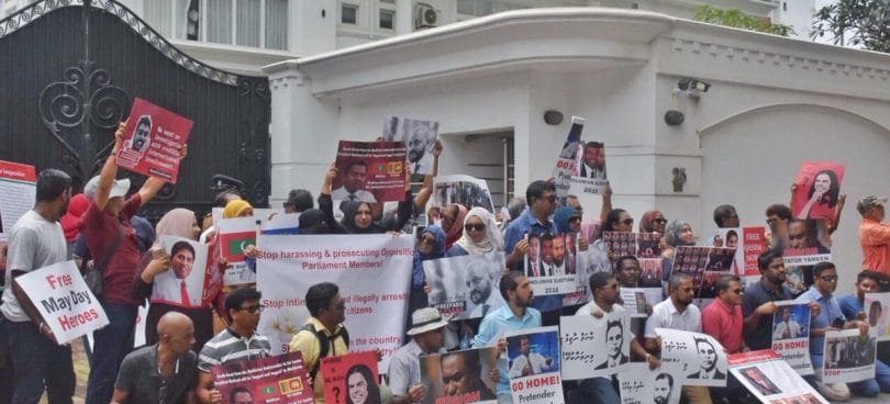 Dozens of opposition supporters protested in front of the Maldivian Embassy in Colombo Thursday against human rights violations.