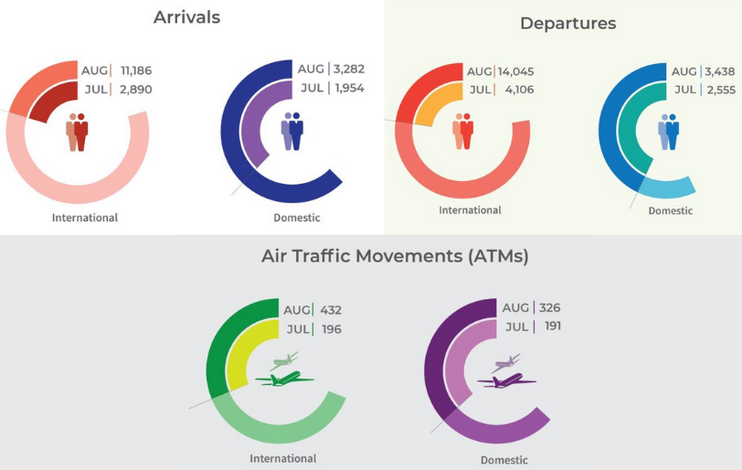 The departures also show a positive trend, with 4106 international departures in July and 14045 in August. Local departures stood at 2,555 during July and 3,438 during the month of August.