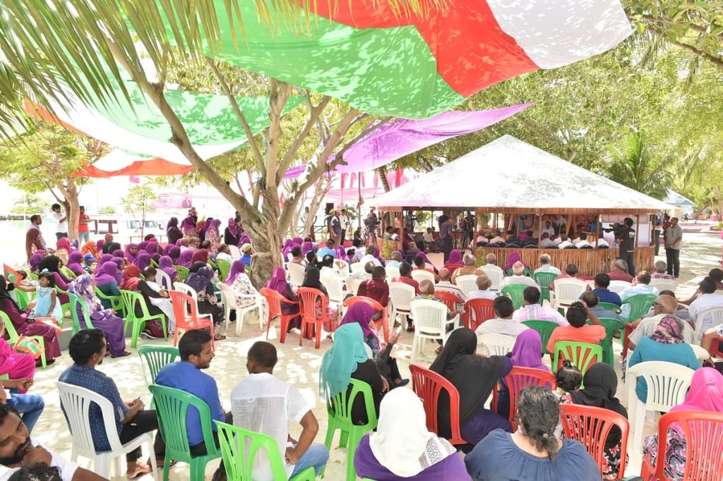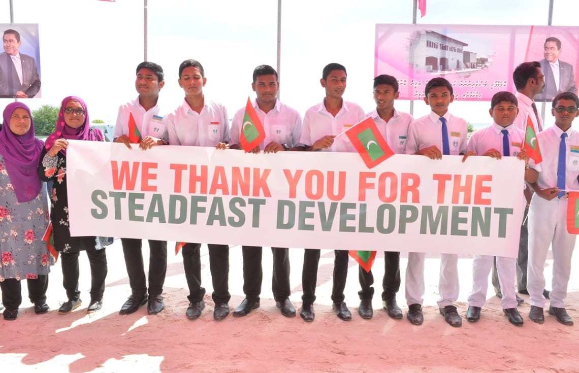 When President Yameen visited Gaafu Alifu Kolamaafushi Island, the local islanders welcomed the president and expressed their gratitude of having fulfilled these basic needs. This was nicely laid out and recited to the president through a poem, by school children. Whilst president was sitting opposite, swinging on a local swing accompanied by his wife.