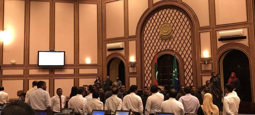 Walled off from protesting MPs by soldiers in plainclothes, Maseeh adjourned the sitting after calling a vote on the president’s nominee for ambassador to Sri Lanka.