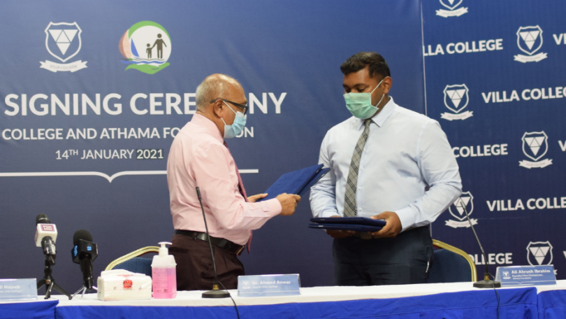 The signing ceremony held at Villa College was commenced by Athama Foundation Founder and Vice Chairperson Ali Ahrush Ibrahim and Villa College Rector Dr. Ahmed Anwar.