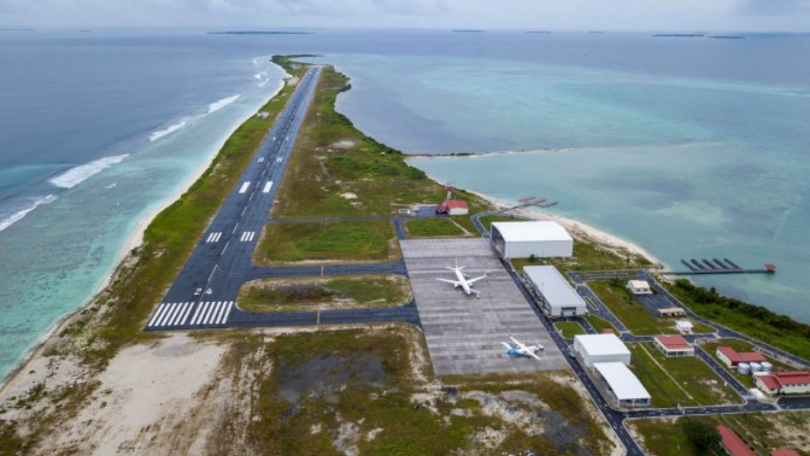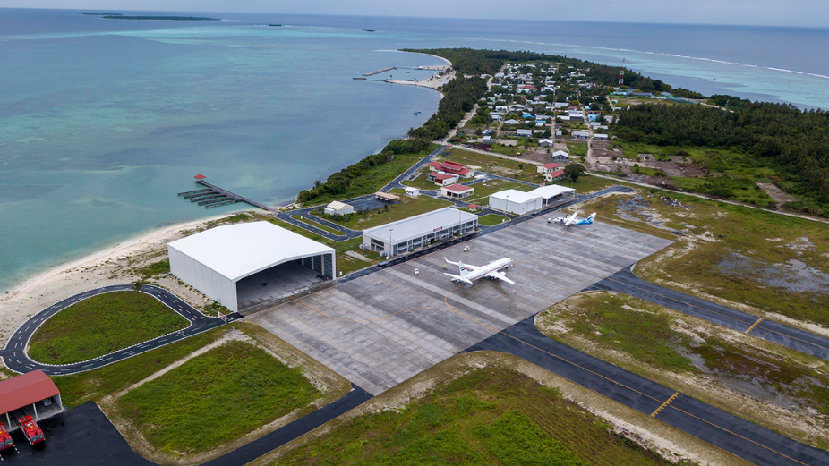 Maafaru airport was developed with a grant aid of US$ 60 million from the United Arab Emirates’s (UAE) Abu Dhabi Fund for Development. The airport was developed by a Singaporean company. The airport boasts a 2,200-meter long runway and is 40 meters wide with a state-of-the-art terminal with a VIP lounge. The airport can land large aircrafts such as Airbus A320 and Boeing 737 and is managed by Maldivian.