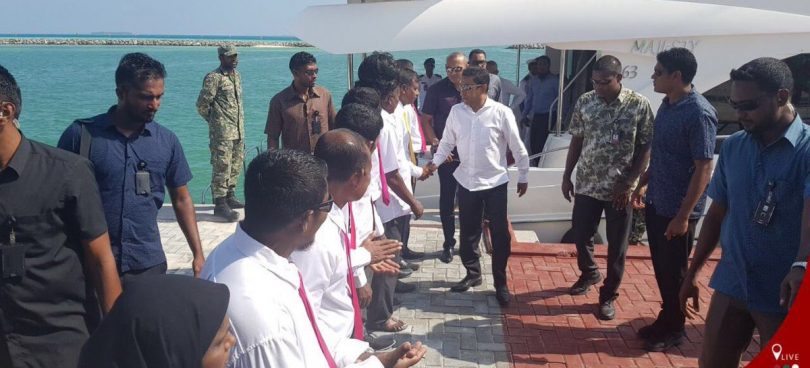 His visit to Thulhaadhoo island, to inaugurate a new harbour, was marred by anti-government protests while pro-government supporters gathered to welcome him and delegates.